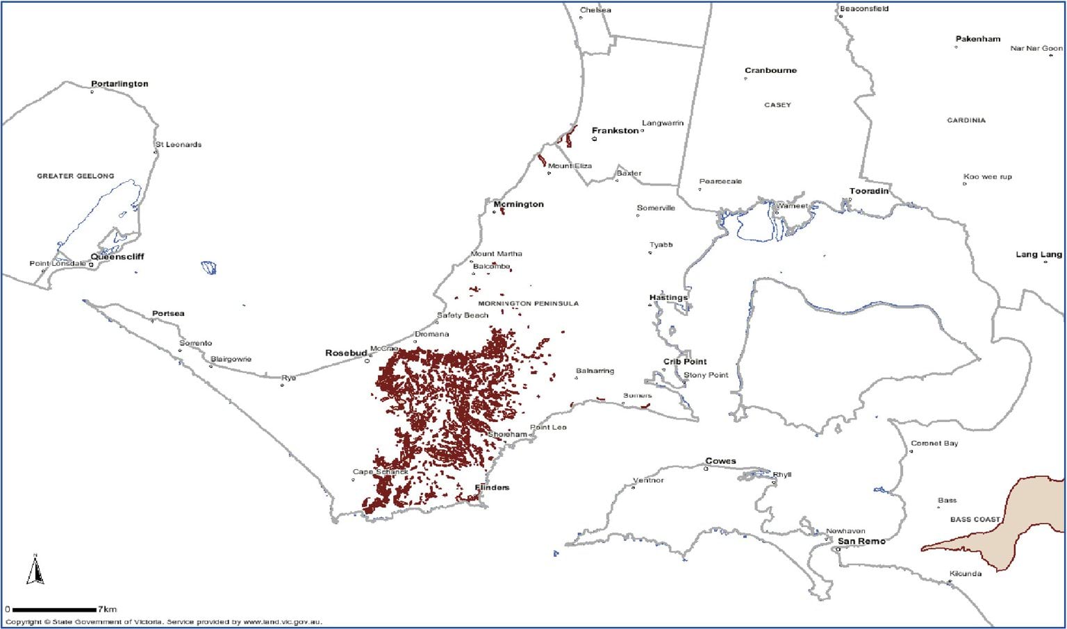 - Problematically, the Central Region Response Plan identifies “areas of concern” for landslide risk management as those areas identified in the EMO schedules of municipal planning schemes.43 As set out in Figure 8.2, it includes the following for the Mornington Peninsula: