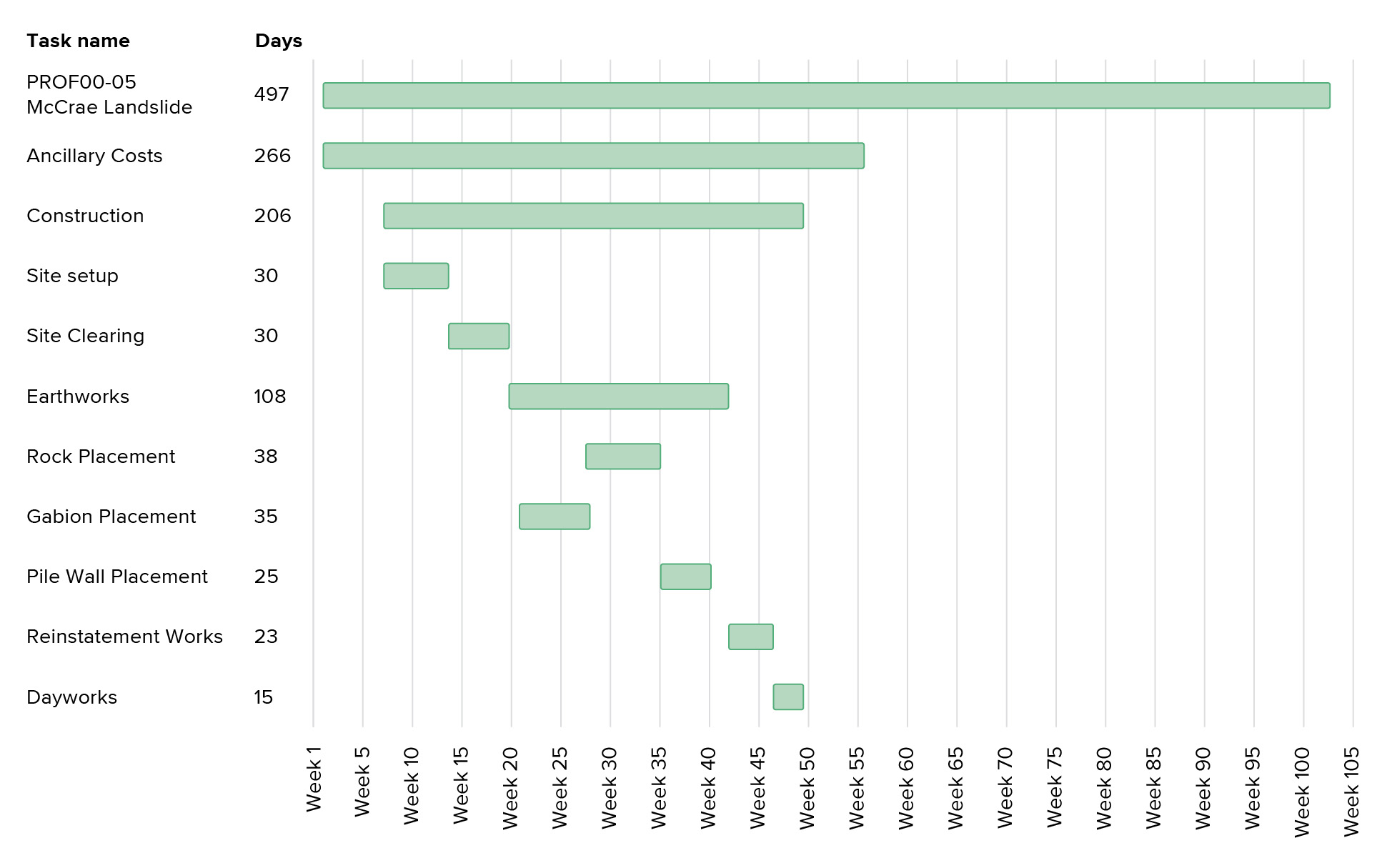 - During the construction of the gabion wall, earthworks would begin in the area of the McCrae Landslide, to remove debris and to build a temporary access road. The access road would allow both the debris further uphill to be removed and enable the rockfill and geofabric separator to be installed. The piled wall and ground beam at the toe would also be constructed. This part of the project is estimated to take 108 days.46