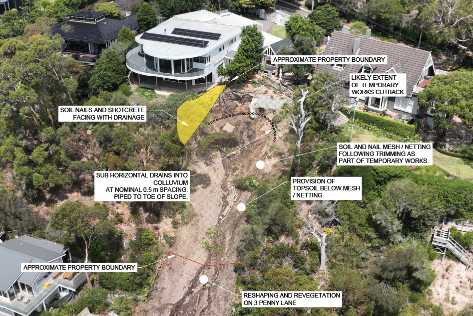 - Mr Paul and Mr Pope have considered the current condition of the landside site and separately developed design concepts to mitigate the risk of further landslides. A common element in both designs is the initial step of clearing debris from 3 Penny Lane before any work proceeds.3 Where the two concepts differ is in their approach to remediation. Mr Paul’s design is more sophisticated, as it seeks not only to mitigate the risk of future landslides but also to repair the damage to the escarpment caused by the landslides.