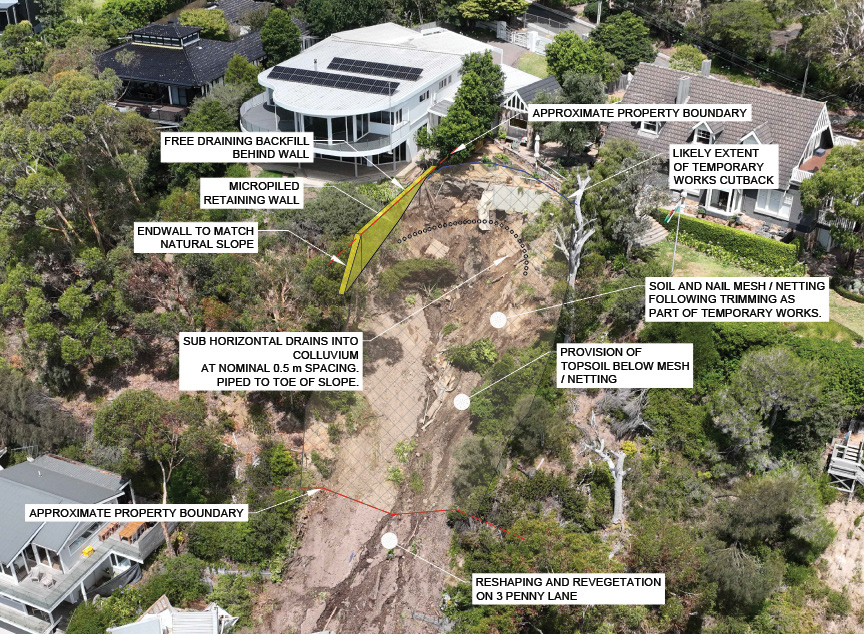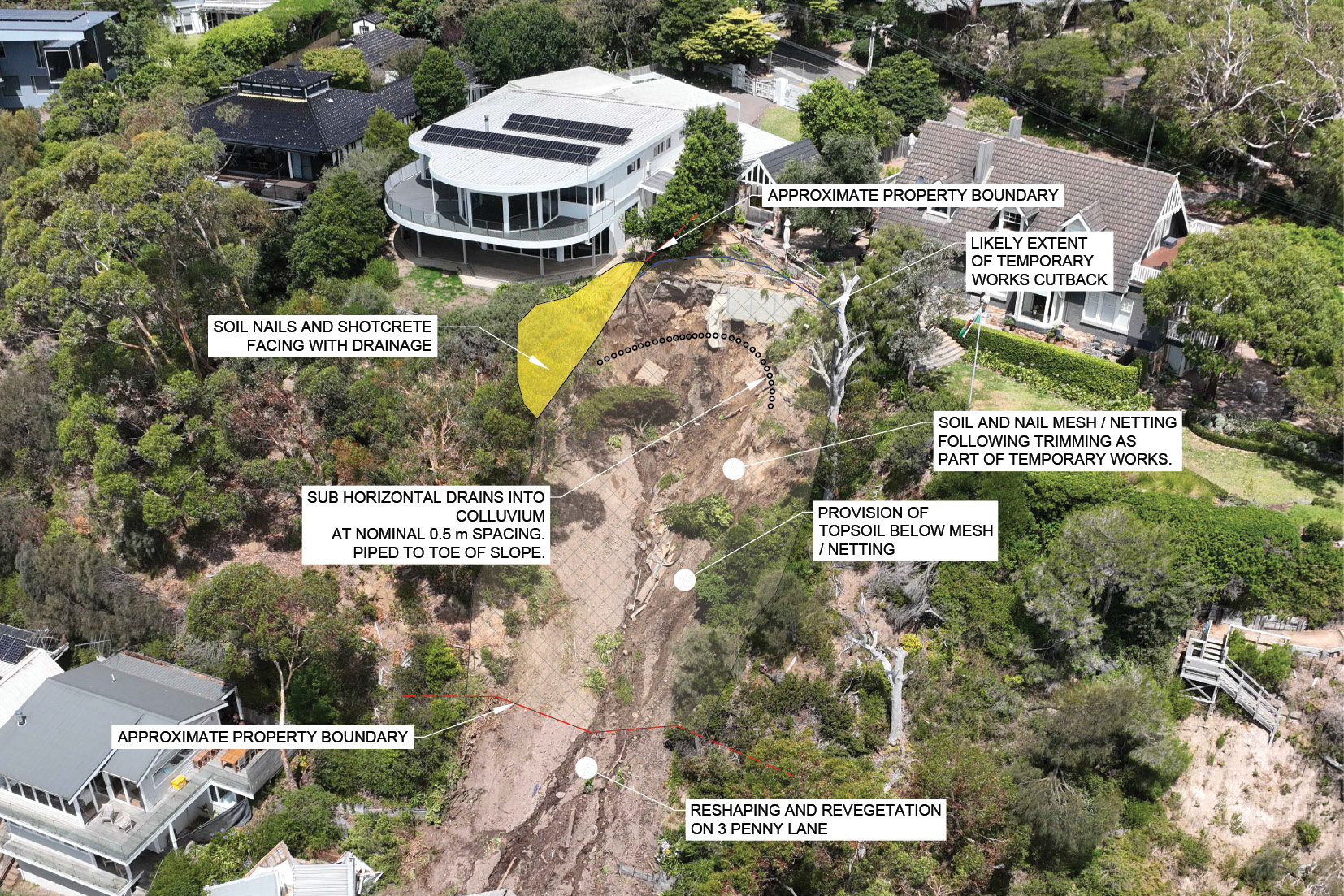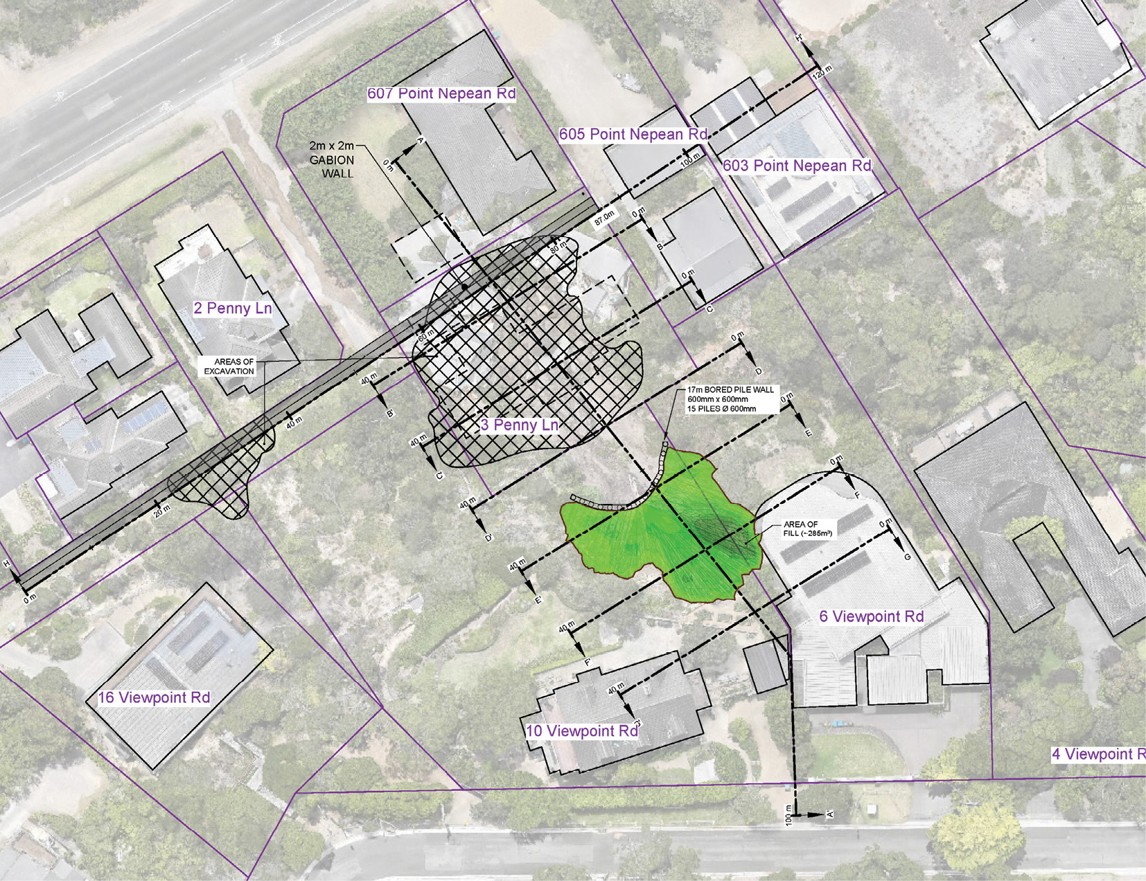 - Slope toe works: this involves demolition of the building debris on 3 Penny Lane and repair work at 607–609 Point Nepean Road.